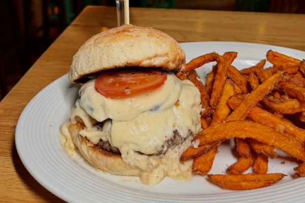 Saftiges Patty, hausgemachtes Bärlauchpesto und eine fein abgestimmte geräucherte Mayo treffen auf knackiges Gemüse und ein außergewöhnliches Bun.
